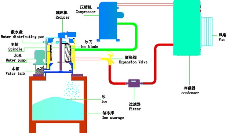 、冰粒机、方冰机、雪花机、块冰机、冰砖机、管冰机、子弹冰机、流态冰机等不同类型的制冰机,不管哪种制冰机,它的制冰机构成,制冰原理是一样的。