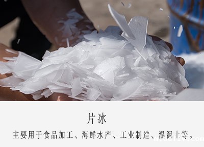 由于片冰巨大的表面积,其热交换过程迅速,片冰可以迅速融化成水、带走热量、为被混合物增加湿度,广泛用于海鲜水产急冻保鲜、超市生鲜、食品加工、渔业、混泥土搅拌等。