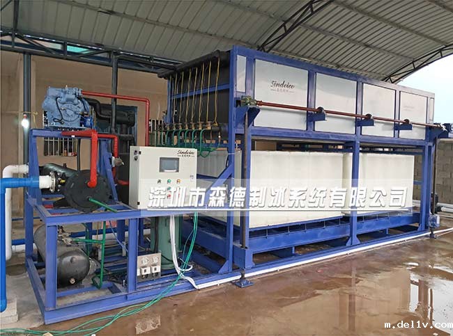 2.盐水块冰机,是间接的制冰方式,以盐水作为热交换的媒介。通过盐水温度下降,使冰桶内的水冻结成冰。脱冰方式需要行车将冰桶吊起,放入融冰池,块冰表面融化后,才能把冰块倒出,需要专业的人工操作。盐水会污染土壤。