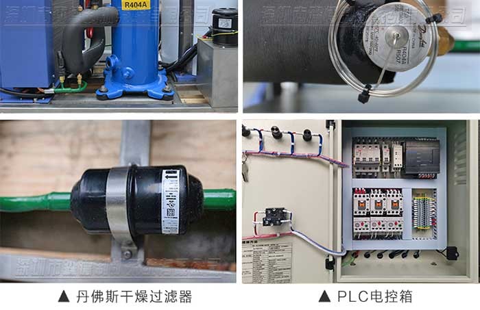 4.采用一线品牌制冷配件:德国比泽尔、丹麦丹佛斯、美国谷轮、台湾汉钟压缩机、意大利莱富康等知名压缩机,丹佛斯电磁阀、膨胀阀、干燥过滤器、美国爱默生膨胀阀等制冷配件,片冰机质量可靠,故障率低,制冰效率高。