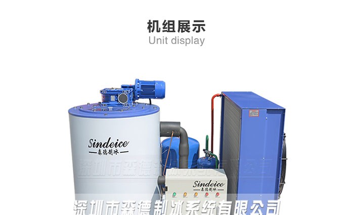 片冰机主要由压缩机、膨胀阀、冷凝器、蒸发器组成,形成一个循环封闭的制冷系统。片冰机蒸发器为垂直竖立的桶装结构,主要由冰刀、主轴、洒水盘、接水盘组成。它们在减速机的带动下,逆时针缓慢旋转。水从片冰机蒸发器的进水口进入分水盘,通过洒水盘,将水均匀的洒在蒸发器内壁,形成水膜;水膜与蒸发器流道中的制冷剂进行热交换,温度迅速降低,在蒸发器内壁上形成一层薄冰,在冰刀的挤压下,碎裂成片冰,从落冰口掉入储冰库。部分未结成冰的水通过接水盘从回水口回流到冷水箱内,通过冷水循环泵进入下一个循环。