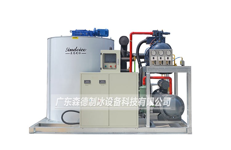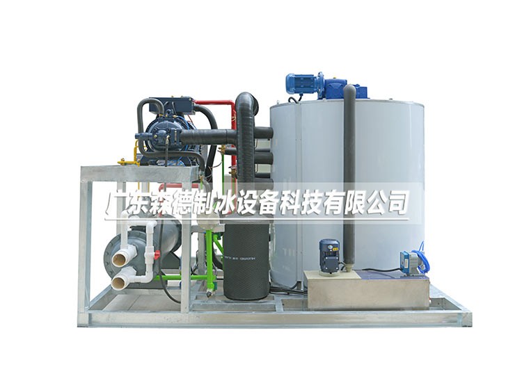 片冰机主要由压缩机、膨胀阀、冷凝器、蒸发器组成,形成一个循环封闭的制冷系统。片冰机蒸发器为垂直竖立的桶装结构,主要由冰刀、主轴、洒水盘、接水盘组成。它们在减速机的带动下,逆时针缓慢旋转。水从片冰机蒸发器的进水口进入分水盘,通过洒水盘,将水均匀的洒在蒸发器内壁,形成水膜;水膜与蒸发器流道中的制冷剂进行热交换,温度迅速降低,在蒸发器内壁上形成一层薄冰,在冰刀的挤压下,碎裂成片冰,从落冰口掉入储冰库。部分未结成冰的水通过接水盘从回水口回流到冷水箱内,通过冷水循环泵进入下一个循环。