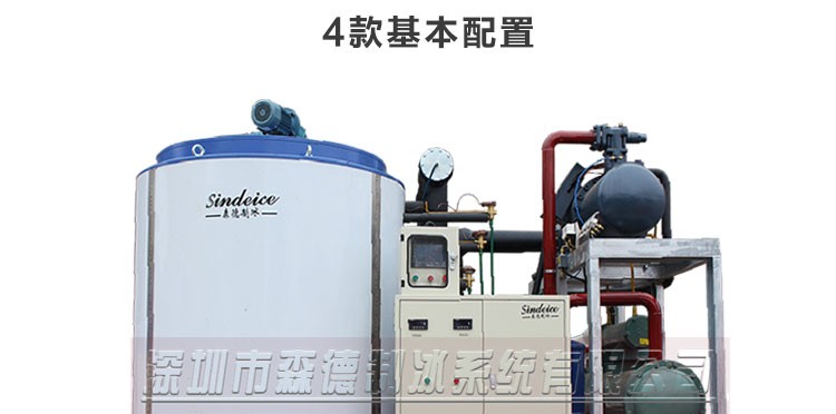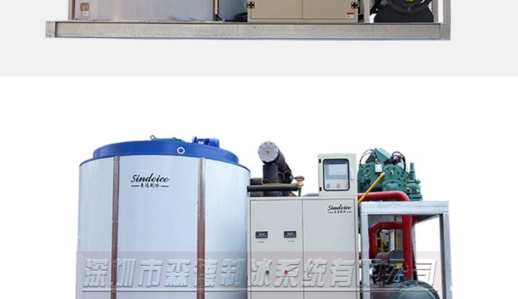 片冰机主要由压缩机、膨胀阀、冷凝器、蒸发器组成,形成一个循环封闭的制冷系统。片冰机蒸发器为垂直竖立的桶装结构,主要由冰刀、主轴、洒水盘、接水盘组成。它们在减速机的带动下,逆时针缓慢旋转。水从片冰机蒸发器的进水口进入分水盘,通过洒水盘,将水均匀的洒在蒸发器内壁,形成水膜;水膜与蒸发器流道中的制冷剂进行热交换,温度迅速降低,在蒸发器内壁上形成一层薄冰,在冰刀的挤压下,碎裂成片冰,从落冰口掉入储冰库。部分未结成冰的水通过接水盘从回水口回流到冷水箱内,通过冷水循环泵进入下一个循环。